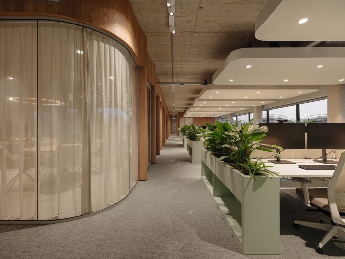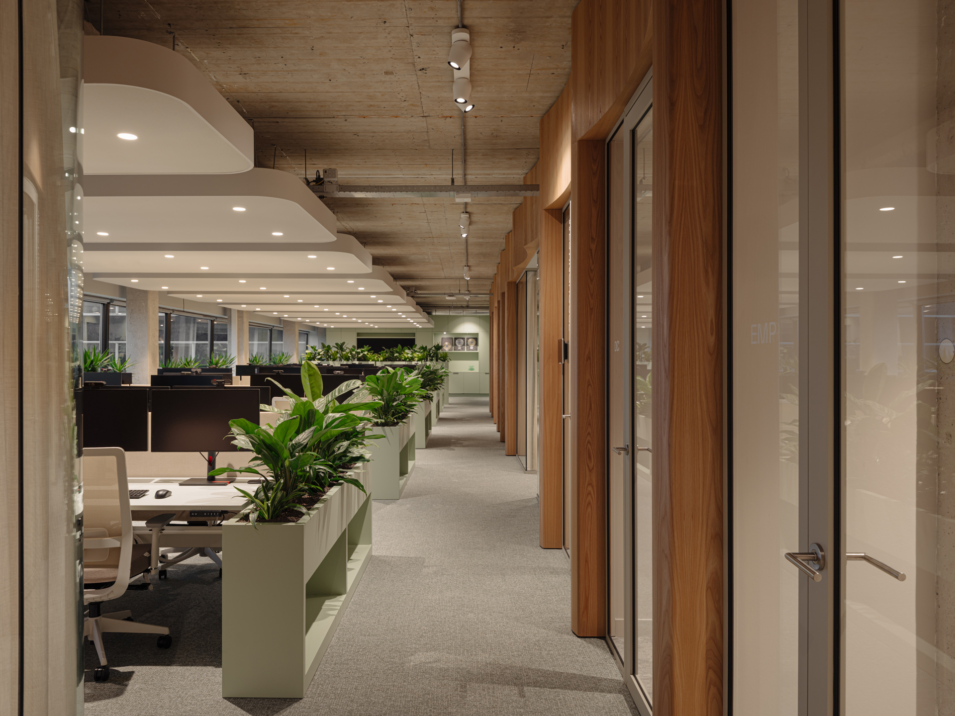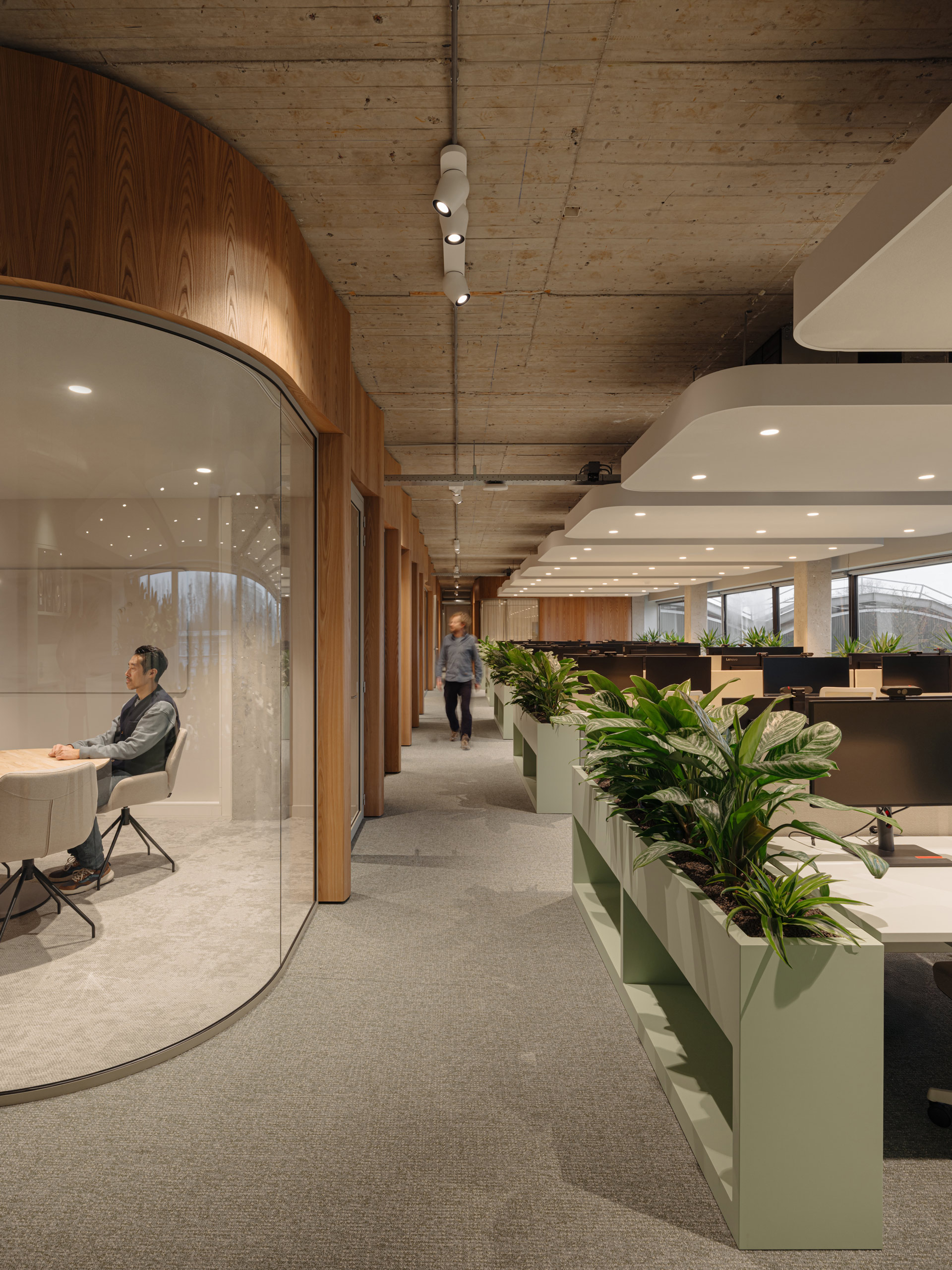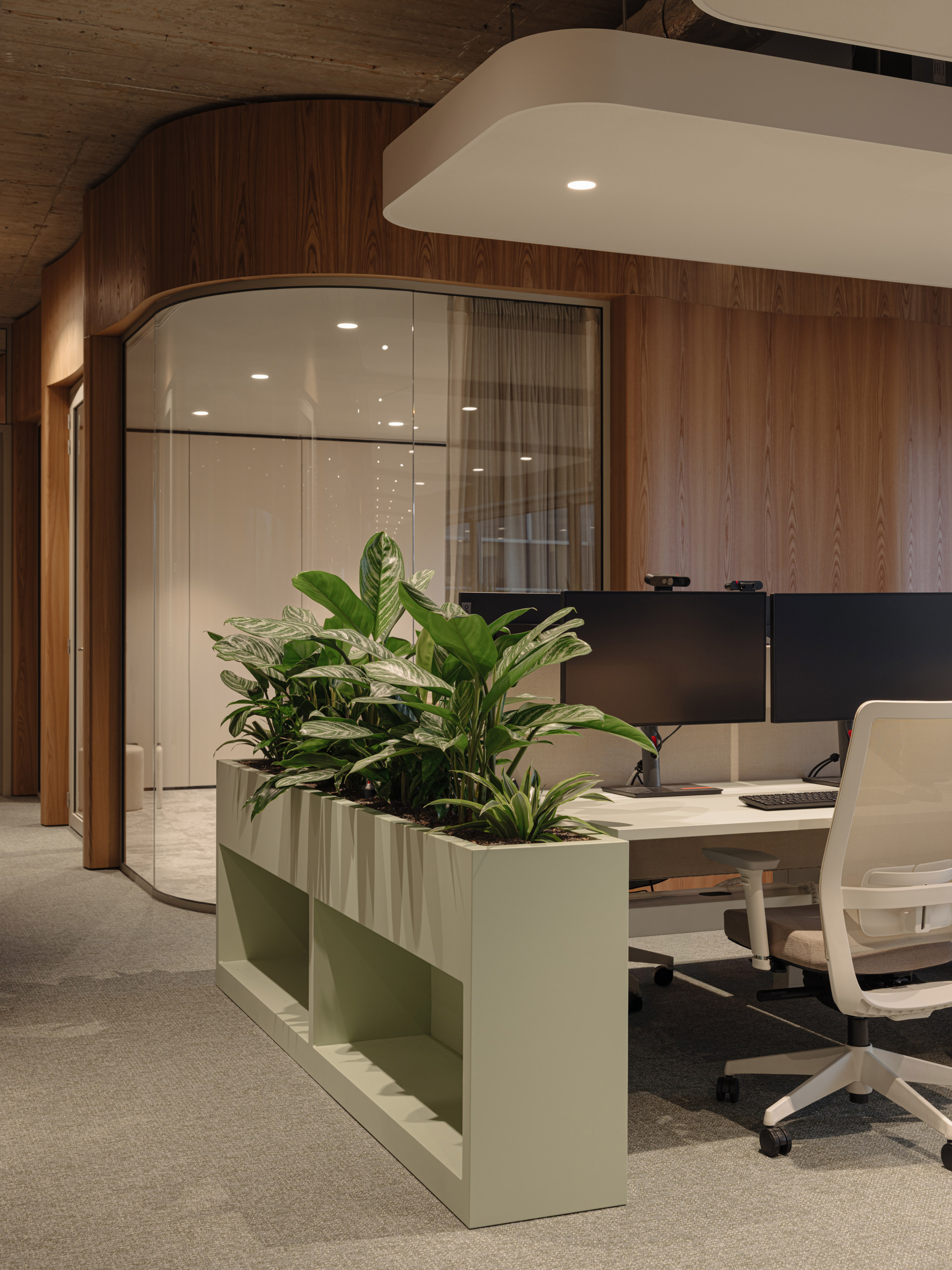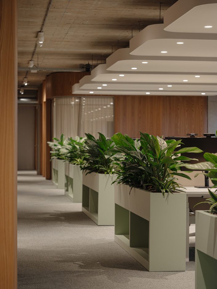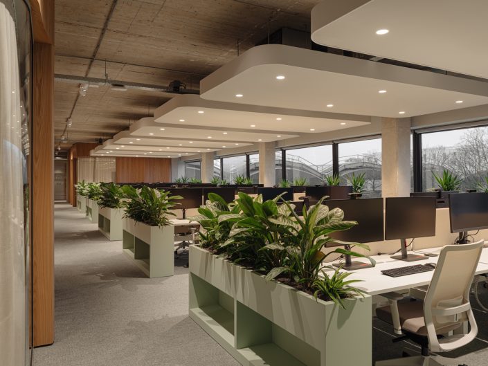 The workspaces are flanked on both sides by integrated planters, allowing employees to work surrounded by greenery. This introduces a soft, natural atmosphere and supports wellbeing, while subtly defining the work areas without compromising the openness of the space.