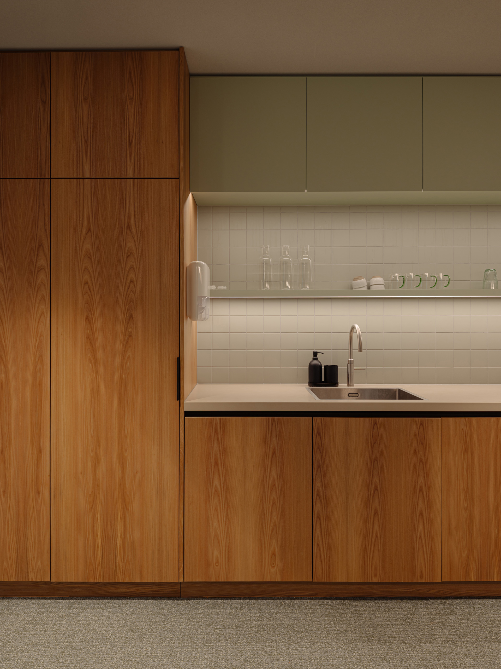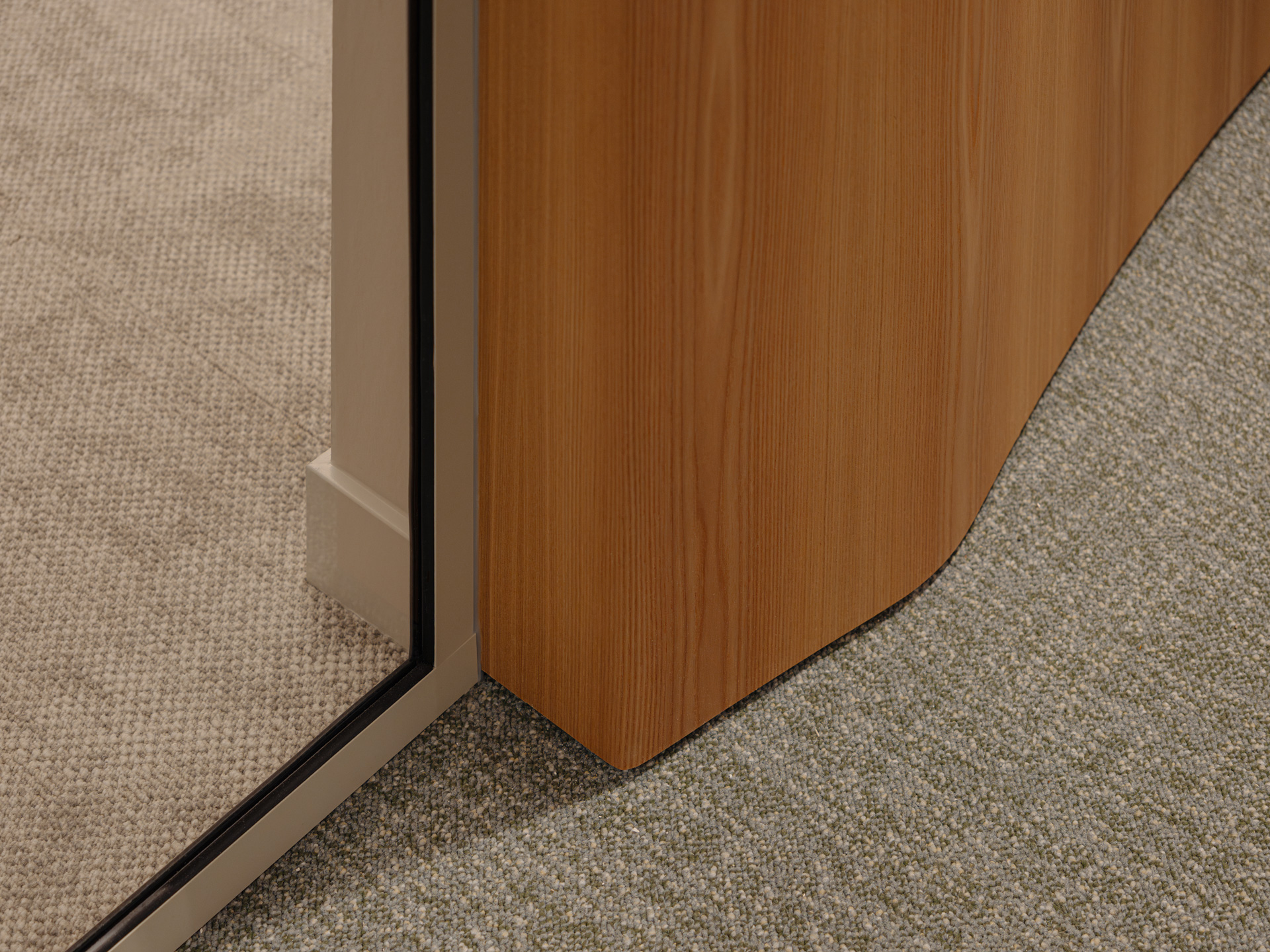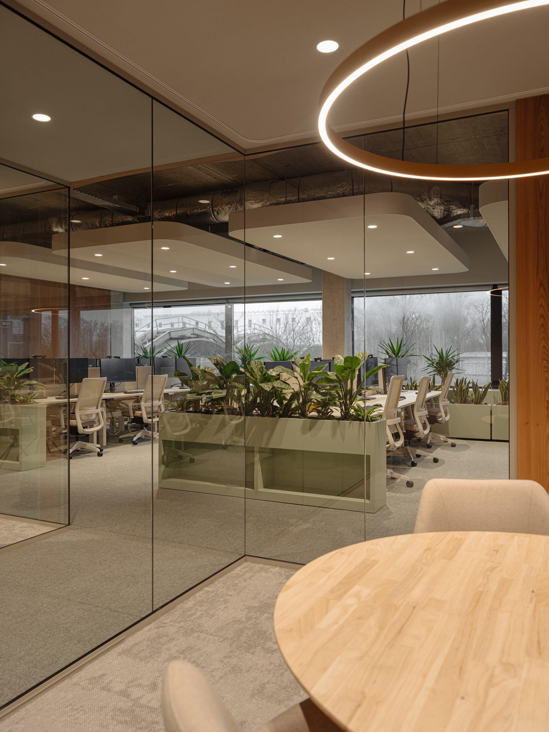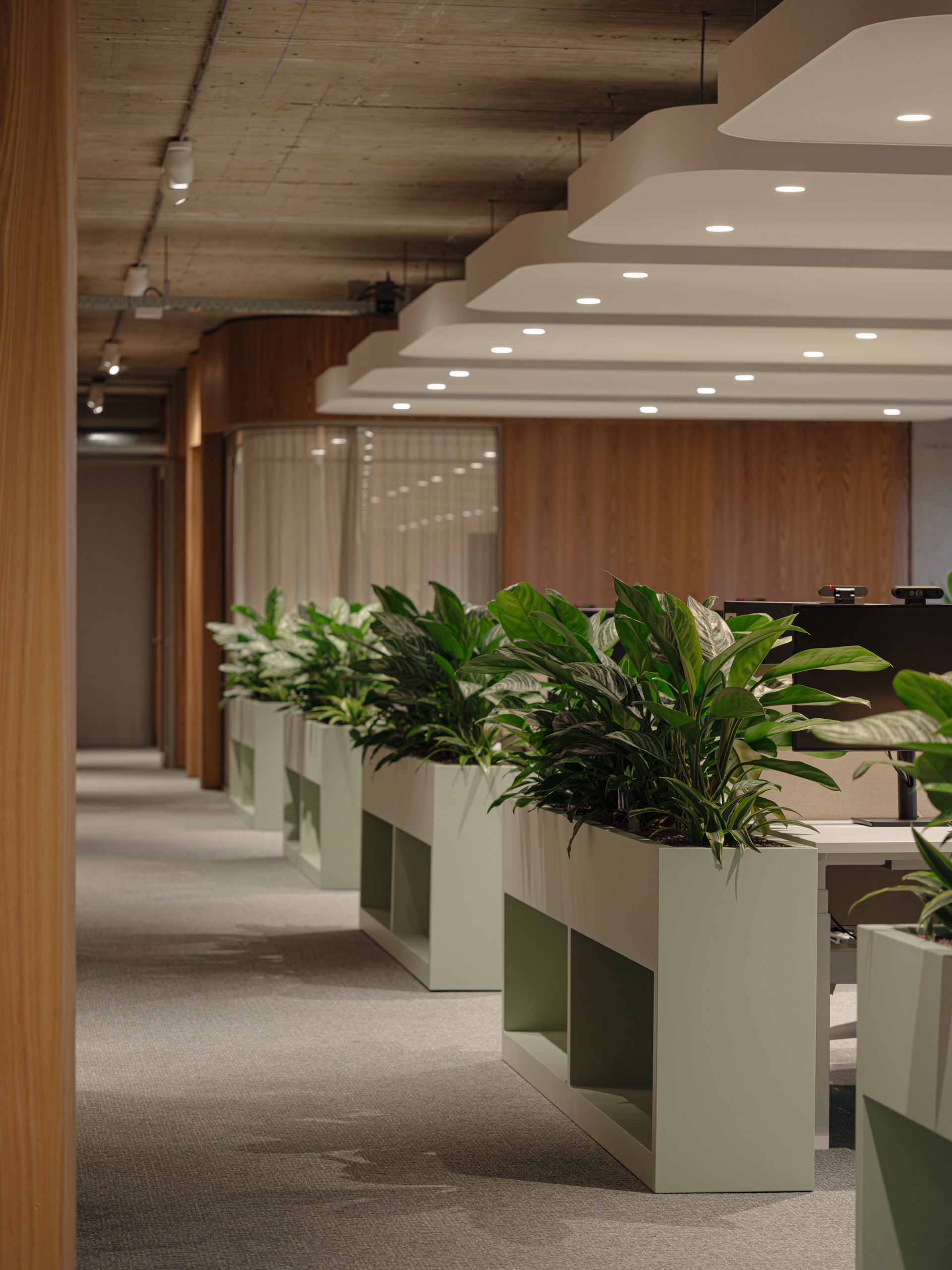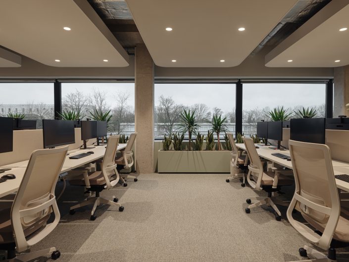 The workspaces are flanked on both sides by integrated planters, allowing employees to work surrounded by greenery. This introduces a soft, natural atmosphere and supports wellbeing, while subtly defining the work areas without compromising the openness of the space.