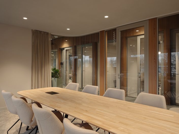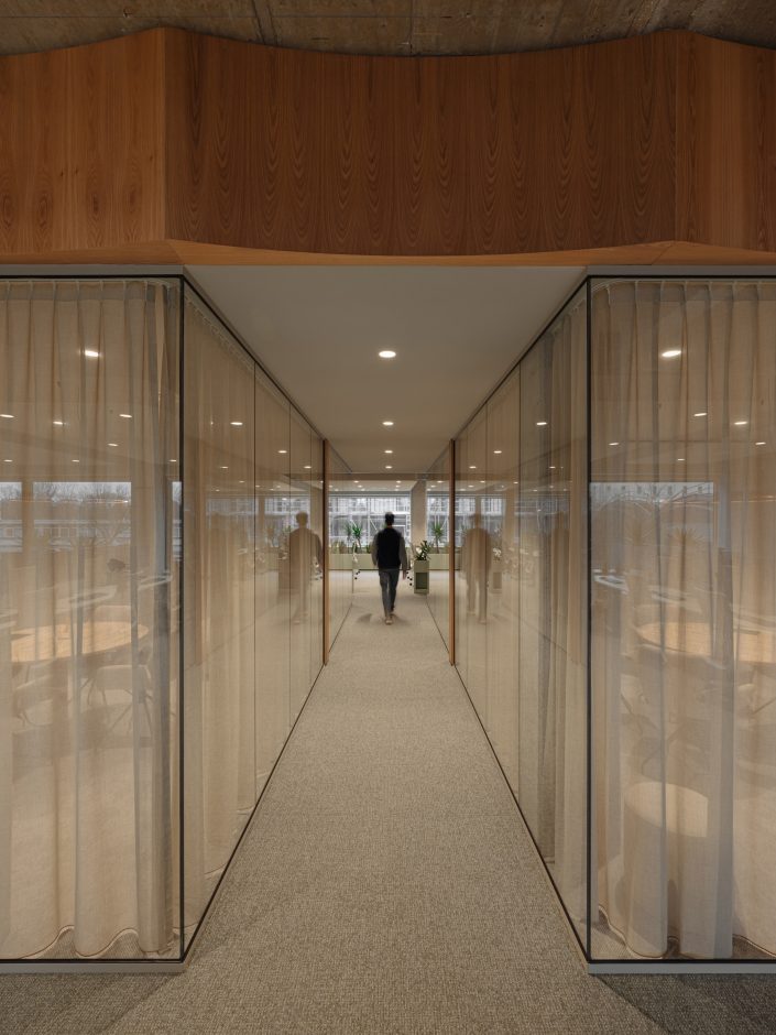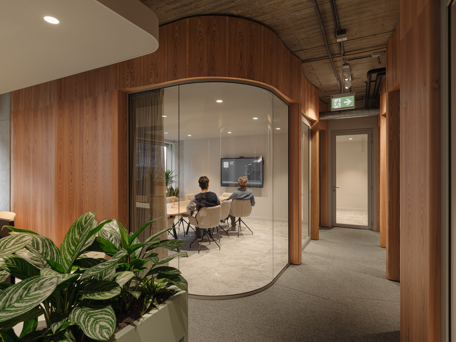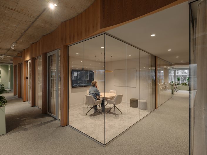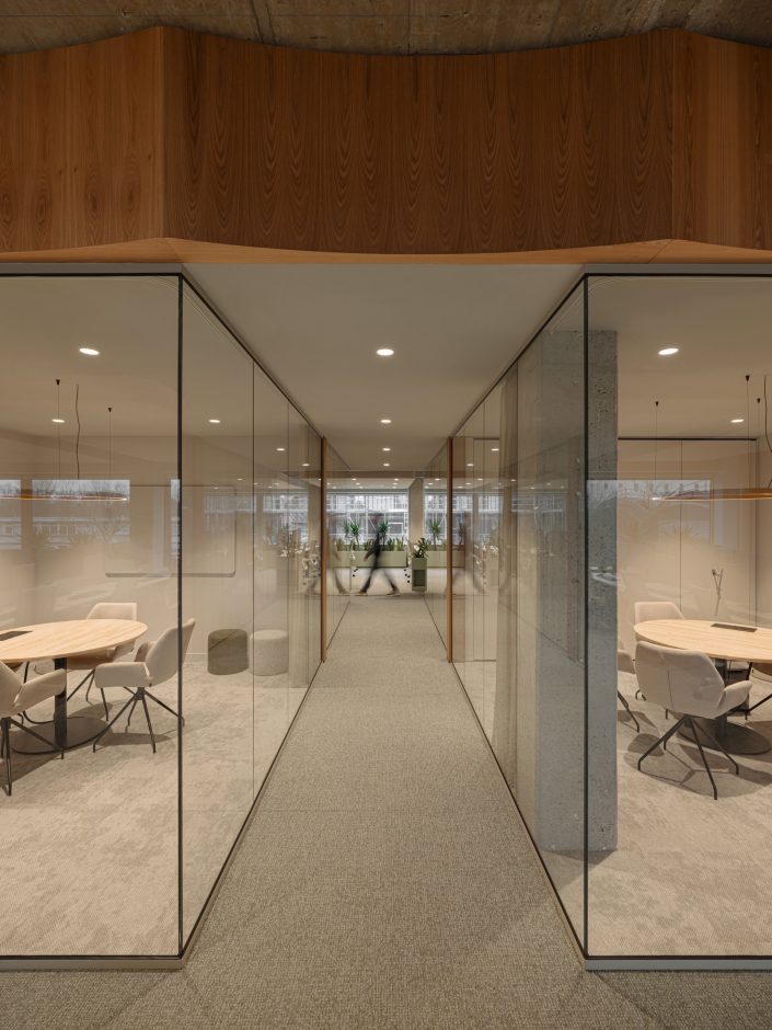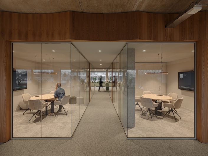 Meeting rooms and collaboration spaces are mainly located at the center of the office and together form the natural heart of the organization. These spaces encourage interaction, knowledge sharing, and connection. They are designed as a cohesive central volume, materialized in wood to emphasize the natural and sustainable character of the interior.