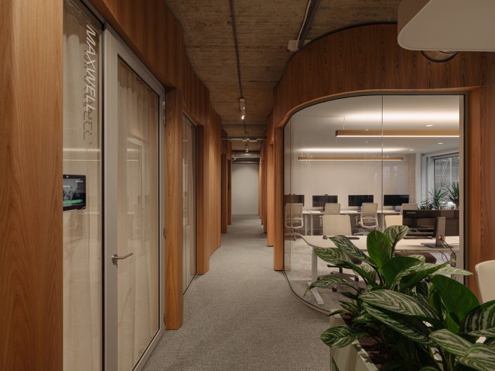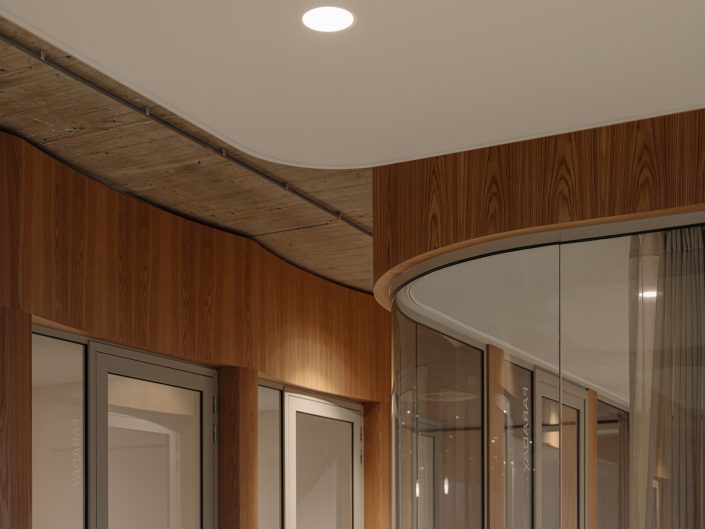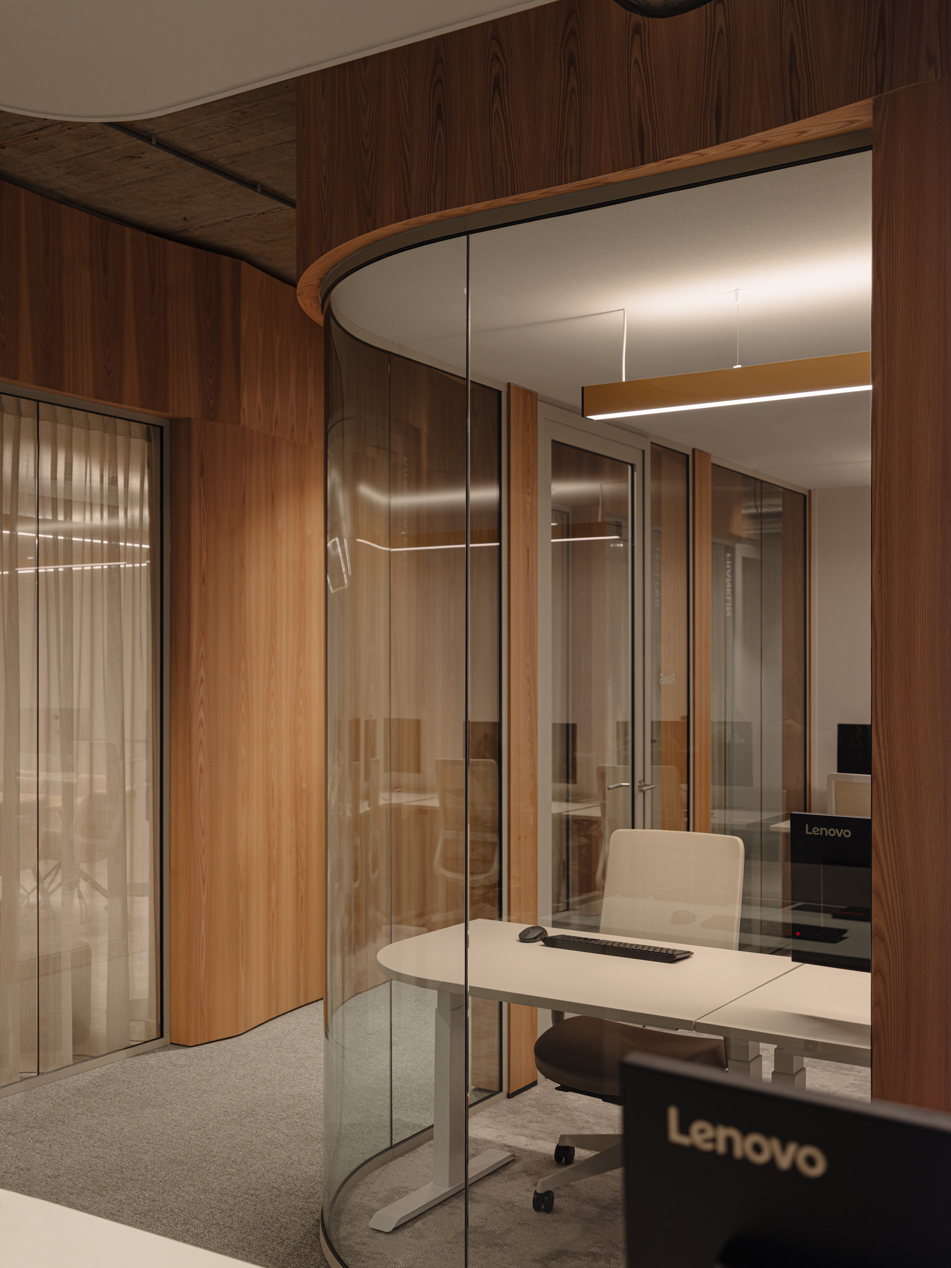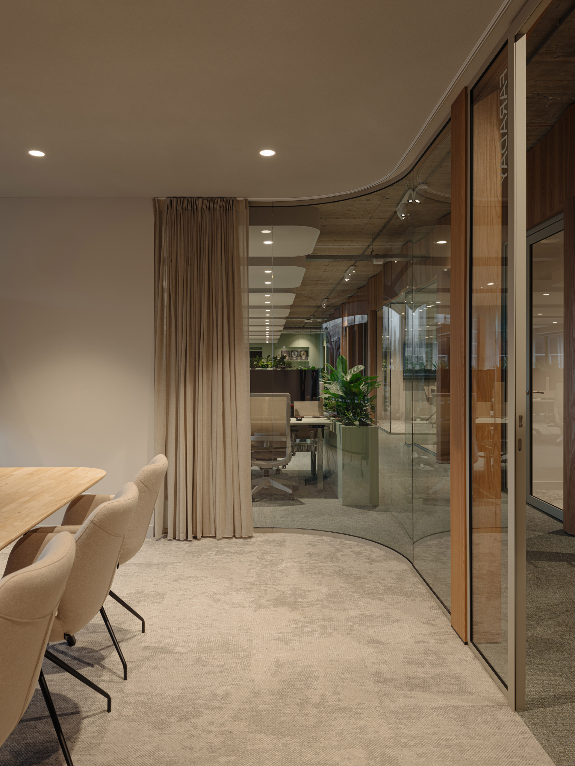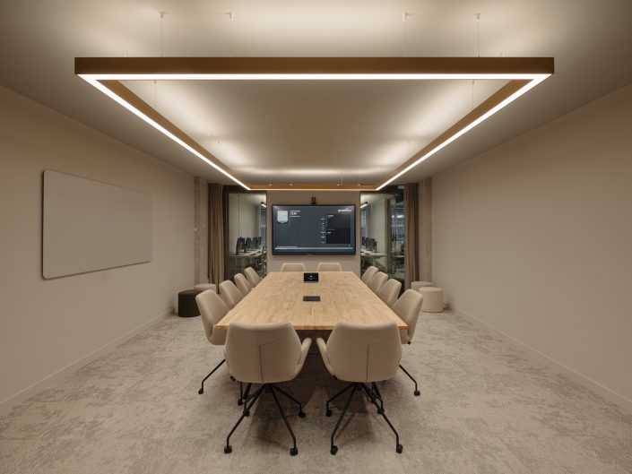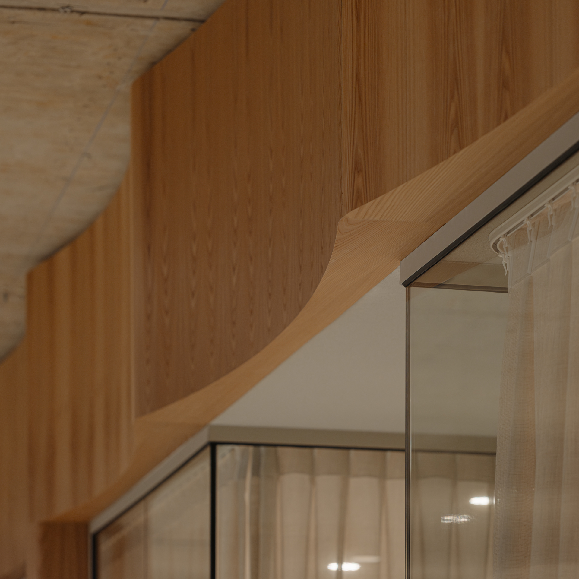 Meeting rooms and collaboration spaces are mainly located at the center of the office and together form the natural heart of the organization. These spaces encourage interaction, knowledge sharing, and connection. They are designed as a cohesive central volume, materialized in wood to emphasize the natural and sustainable character of the interior.