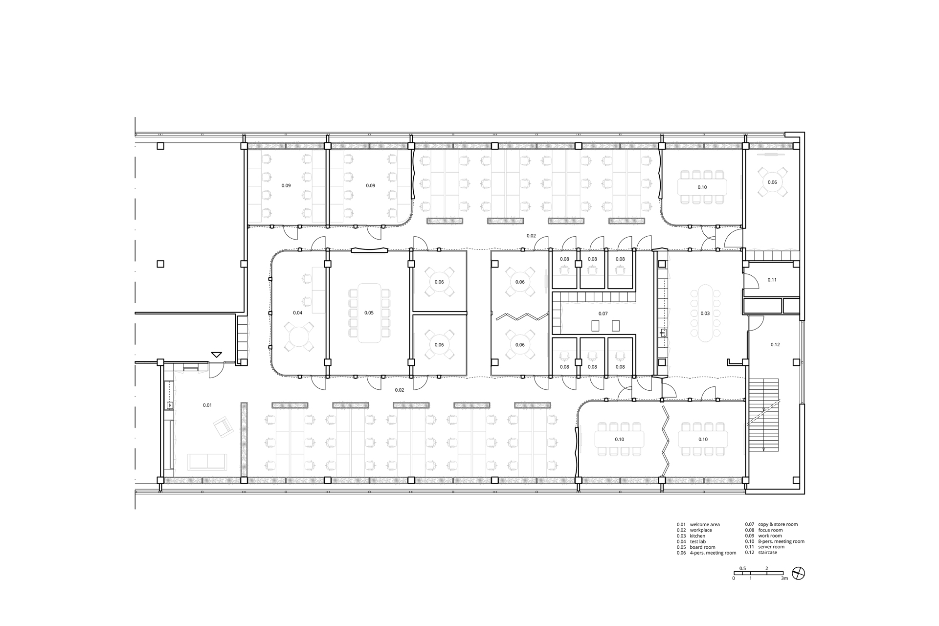 A key design principle was maximizing daylight and visual connection to the outside. The entrance is therefore deliberately oriented toward a bright façade-facing area, creating an open and inviting first impression upon arrival. The open workstations are also positioned along the façade, ensuring ample natural light and views to the surrounding.